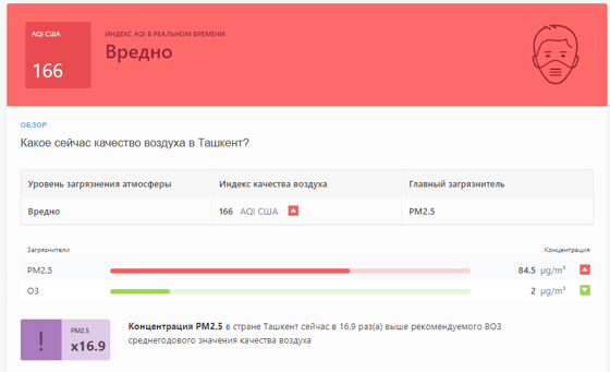 В 08:40 станция мониторинга в столице Узбекистана показывала результат в 166 AQI. Концентрация PM2.5 — в 16,9 раза выше рекомендуемого ВОЗ среднегодового значения качества воздуха.