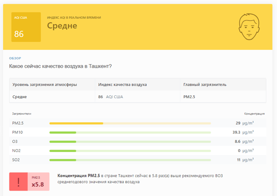 В 09:05 станция мониторинга в столице Узбекистана показывала результат в 86 AQI. Концентрация PM2.5 — в 5,8 раза выше рекомендуемого ВОЗ среднегодового значения качества воздуха.