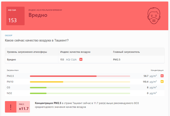 В 08:45 станция мониторинга в столице Узбекистана показывала результат в 153 AQI. Концентрация PM2.5 — в 11,7 раза выше рекомендуемого ВОЗ среднегодового значения качества воздуха.