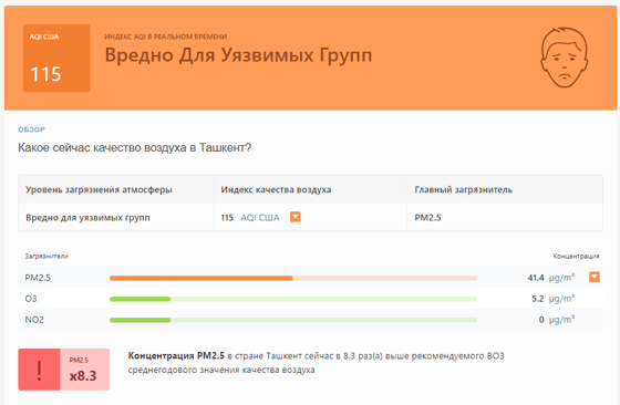 В 08:55 станция мониторинга в столице Узбекистана показывала результат в 115 AQI. Концентрация PM2.5 — в 8,3 раза выше рекомендуемого ВОЗ среднегодового значения качества воздуха.