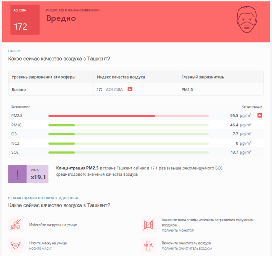 В 09:10 станция мониторинга в столице Узбекистана показывала результат в 172 AQI. Концентрация PM2.5 — в 19,1 раза выше рекомендуемого ВОЗ среднегодового значения качества воздуха.