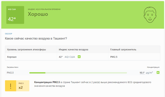 В 08:30 станция мониторинга в столице Узбекистана показывала результат в 42 AQI. Концентрация PM2.5 — в 2 раза выше рекомендуемого ВОЗ среднегодового значения качества воздуха.