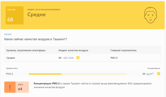 В 08:20 станция мониторинга в столице Узбекистана показывала результат в 68 AQI. Концентрация PM2.5 — в 4 раза выше рекомендуемого ВОЗ среднегодового значения качества воздуха.