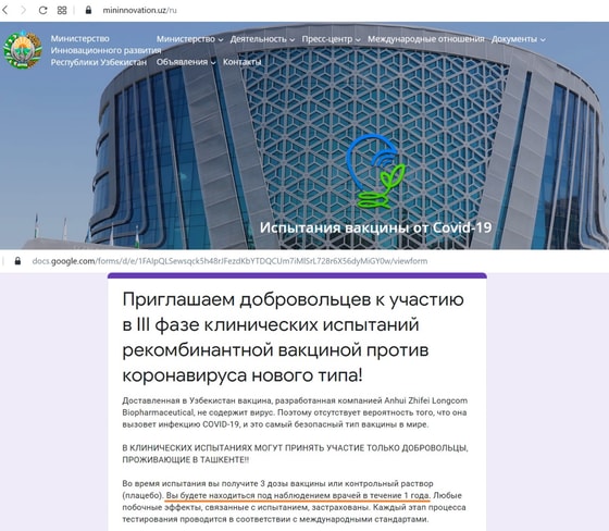 А у нас? У нас на главной странице сайта Министерстве инновационного развития появилась надпись «Испытания вакцины от Covid-19».