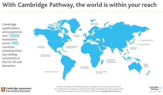 В международном сообществе CAIE более 10 000 школ в 160+ странах мира, и ежегодно более 8 млн детей сдают Кембриджские экзамены. Многие ведущие университеты и работодатели по всему миру высоко оценивают качество и компетентность выпускников Кембриджских школ, что является также одной из причин выбора сотрудничества с Кембриджем. Еще одним немаловажным фактором развития школы является профессиональное развитие учителей и получение дополнительного опыта и квалификаций, предоставляемыми CAIE.