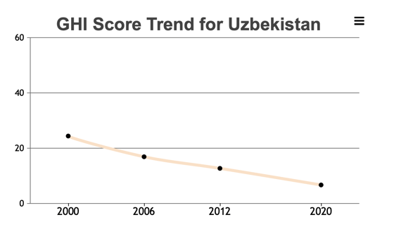 В глобальном индексе голода 2020 года Узбекистан занимает 30-е место из 107 стран, набрав 6.7 баллов. Отмечается, что страна вошла в число 47 стран с низким уровнем голода.