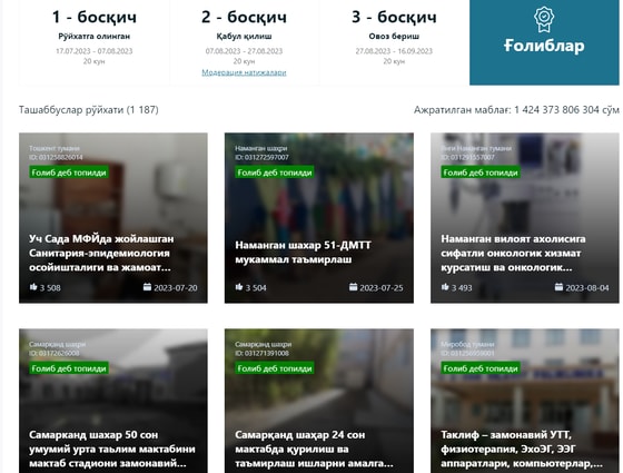 По итогам голосования выиграли 1 187 предложений, которые получат финансирование в размере 1,42 трлн сумов.