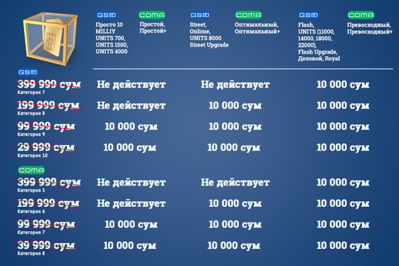 Выбирайте выгодный тариф и подключайте «красивые» номера с грандиозной выгодой. Например, при подключении на тарифы Flash, Flash Upgrade, Royal, Деловой, UNITS (11000, 14000, 18000 или 22000) или MILLIY, вы можете получить красивый номер с первоначальной стоимостью 399 999 сумов всего за 10 000 сумов.