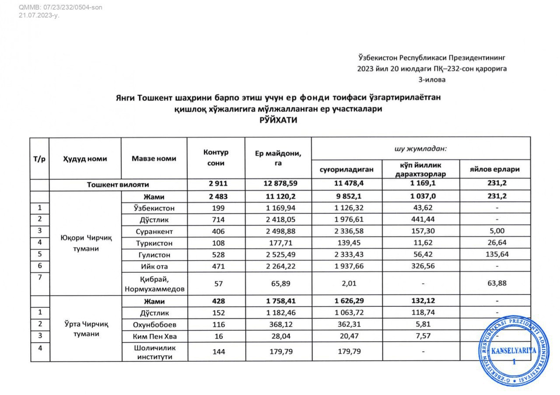 Из Юкоричирчикского и Уртачирчикского районов Ташкентской области передадут более 19 тысяч га земли для строительства города «Новый Ташкент», говорится в постановлении президента Шавката Мирзиёева.