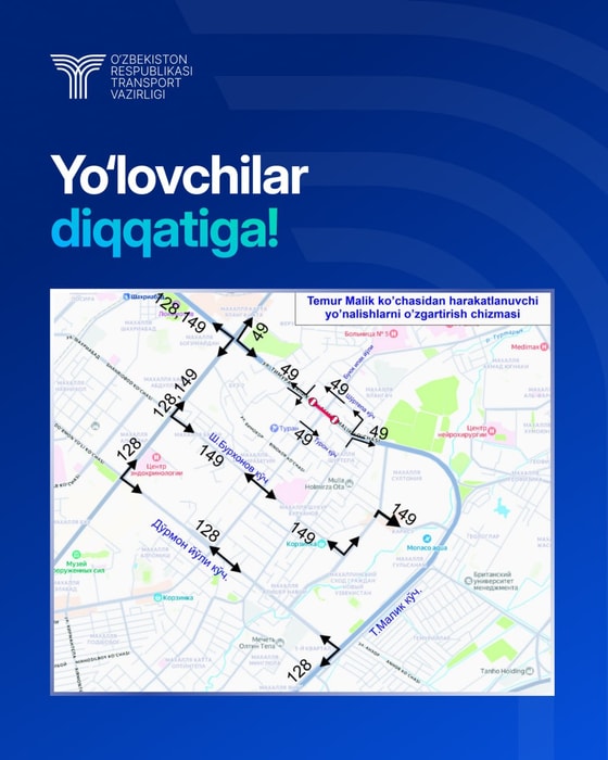 • движение автобуса №149 в обоих направлениях будет организовано по улицам Мингбулок, Ш. Бурханова, Мирзо Улугбека, Т. Малика.