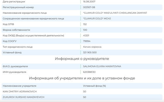 Согласно данным Единого государственного реестра субъектов предпринимательства, компания Glamur Gold зарегистрирована 16 августа 2007 года в форме малого предприятия. Руководителем указана Салимова Эльвира Маратовна. Учредители с равными долями в 50% – Кан Дмитрий Адрианович и Зухуров Хуршид Хамзаевич.