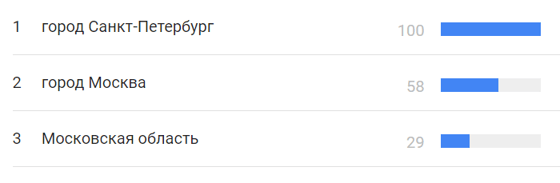 Основные запросы поступают из Санкт-Петербурга. Далее по списку идут Москва и Подмосковье.