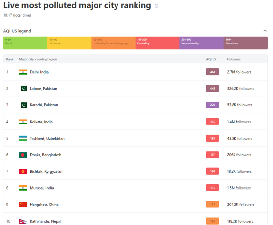 Ташкент попал в пятерку городов мира с самым загрязненным воздухом, следует из отчета портала IQAir.