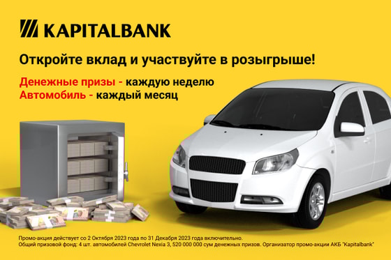 Участие в розыгрыше могут принять клиенты банка, открывшие валютный вклад «Zor 7%» или сумовой «Проценты каждый день на Visa» в период с 1 сентября по 31 декабря 2023 года. Каждый месяц АКБ «Капиталбанк» будет разыгрывать по одному автомобилю Chevrolet Nexia 3, а также 9 денежных призов на сумму от 3 000 000 сум до 10 000 000 сум.