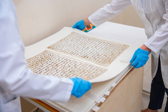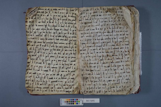 Это был очень кропотливый труд, разделённый на три этапа. На первом (7–12 ноября 2019 года) был создан план реставрации, проведены письменные описания и фотофиксации состояния Корана. Страницы были демонтированы на отдельные листы, удалена прежняя прошивка, из-за которой края страниц повреждались.