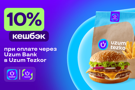 Теперь при оплате заказов в Uzum Tezkor через приложение Uzum Bank можно получить кешбэк 10%.