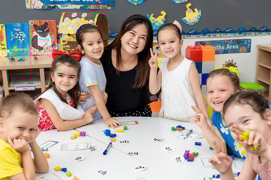 В игровой зоне несколько детей вместе строят «дом» из мягких блоков. Мисс Дженилин направляет их: Let’s make one plan together. Дети слушают, предлагают идеи, договариваются — это лёгкая форма командного взаимодействия.