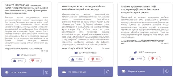 По данным издания, несколько петиций, которые также были опубликованы на сайте Mening fikrim, не были решены своевременно.