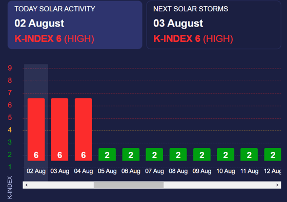 Завтра и послезавтра (3-4 августа) будут наблюдаться аналогичные геомагнитные показатели.