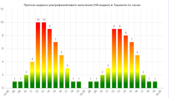 Сегодня (14 мая) в Ташкенте ожидается экстремальный уровень ультрафиолетового излучения, следует из данных сервиса Meteonova.