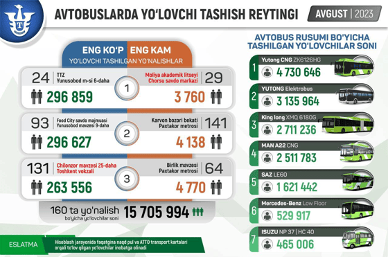 За период с 1 по 31 августа общее количество пассажиров, перевезенных по 160 маршрутам, составило 15 705 994 человека.