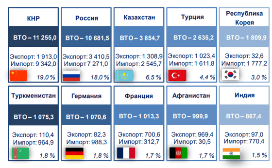 Лидирующую позицию по-прежнему занимает Китай — $11,2 млрд. На второй строчке расположилась Россия — $10,6 млрд. Тройку замыкает Казахстан — $3,8 млрд.