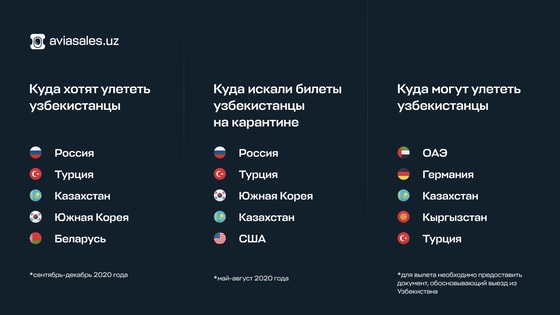 В тройку популярных стран, куда хотели бы улететь узбекистанцы с сентября по декабрь входят Россия, Турция и Казахстан.