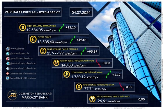 Курс доллара составил 12 584,05 сумов (+12,15), фунта 15 977,97 сумов (+95,89), евро 13 535,40 сумов (+69,64), а рубля 143,80 сумов (-0,03).