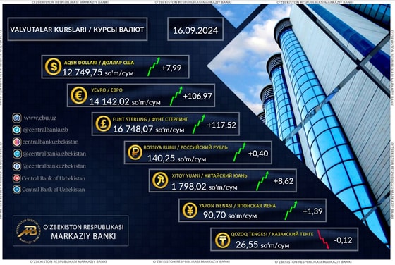 Курс доллара составил 12 749,75 сумов (+7,99), фунта 16 748,07 сумов (+117,52), евро 14 142,02 сумов (+106,97), а рубля 140,25 сумов (+0,40).