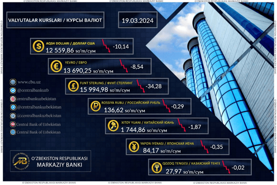 Курс доллара составил 12 559,86 сумов (-10,14), фунта 15 994,98 сумов (-34,28), евро 13 690,25 сумов (-8,54), а рубля 136,62 сумов (-0,29).