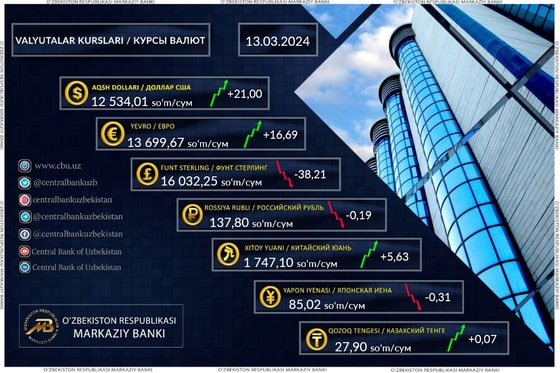 Курс доллара составил 12 534,01 сумов (+21,00), фунта 16 032,25 сумов (-38,21), евро 13 699,67 сумов (+16,69), а рубля 137,80 сумов (-0,19).