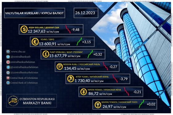 Курс доллара составил 12 347,63 сумов (-9,48), фунта 15 677,79 сумов (+0,32), евро 13 600,91 сумов (+3,15), а рубля 134,45 сумов (-0,27).