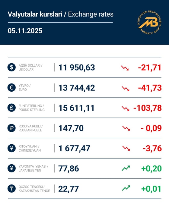 Курс доллара составил 11 950,63 сумов (-21,71), фунта 15 611,11 сумов (-103,78), евро 13 744,42 сумов (-41,73), а рубля 147,70 сумов (-0,09).