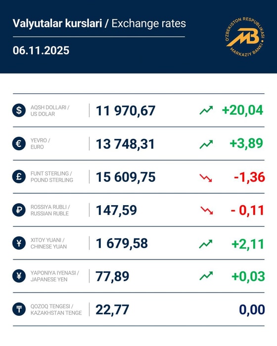 Курс доллара составил 11 970,67 сумов (+20,04), фунта 15 609,75 сумов (-1,36), евро 13 748,31 сумов (+3,89), а рубля 147,59 сумов (-0,11).