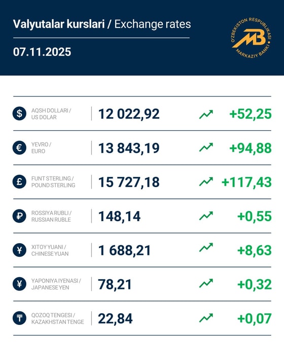 Курс доллара составил 12 022,92 сумов (+52,25), фунта 15 727,18 сумов (+117,43), евро 13 843,19 сумов (+94,88), а рубля 148,14 сумов (+0,55).