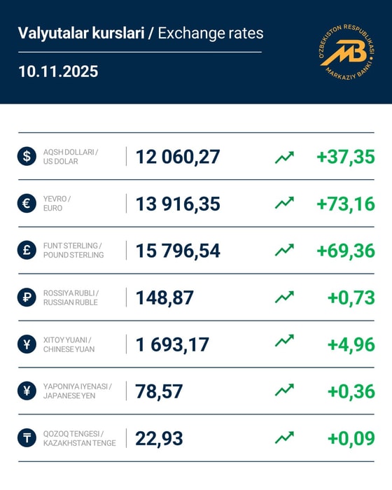 Курс доллара составил 12 060,27 сумов (+37,35), фунта 15 796,54 сумов (+69,36), евро 13 916,35 сумов (+73,16), а рубля 148,87 сумов (+0,73).