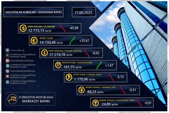 Курс доллара составил 12 715,13 сумов (-45,08), фунта 17 274,78 сумов (-8,92), евро 14 730,48 сумов (+25,61), а рубля 161,75 сумов (+1,67).