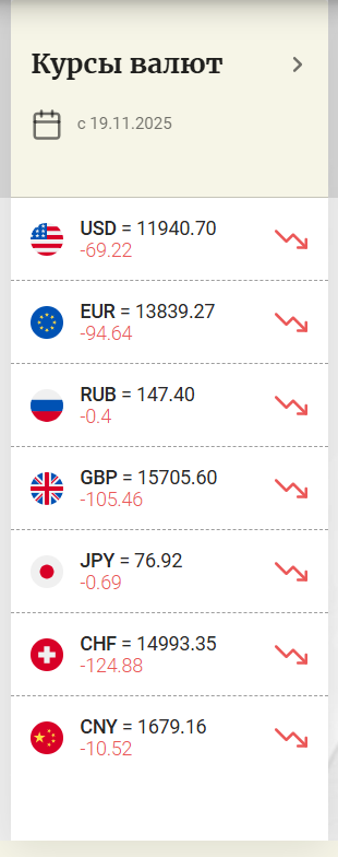 Курс доллара составил 11 940,70 сумов (-69,22), фунта 15 705,60 сумов (-105,46), евро 13 839,27 сумов (-94,64), а рубля 147,40 сумов (-0,40).
