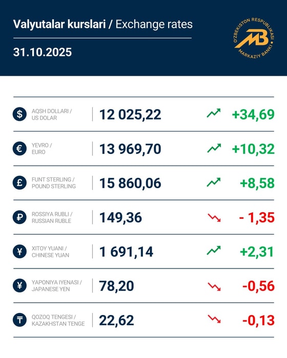 Курс доллара составил 12 025,22 сумов (+34,69), фунта 15 860,06 сумов (+8,58), евро 13 969,70 сумов (+10,32), а рубля 149,36 сумов (-1,35).