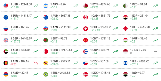 Курс доллара составил 12 141,38 сумов (+15,28), фунта 16 443,07 сумов (+157,72), евро 14 313,47 сумов (+141,7), а рубля 160,26 сумов (+1,15).