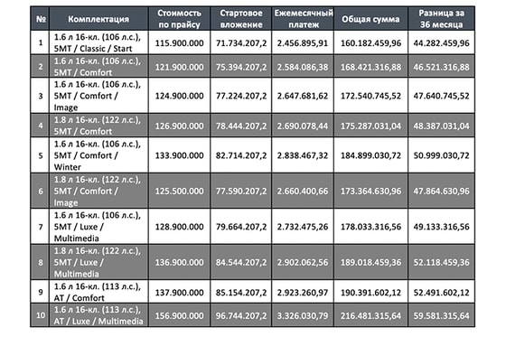 Таблица расчетов моделей LADA Vesta седан в лизинг с предоплатой 50% - на 36 месяцев