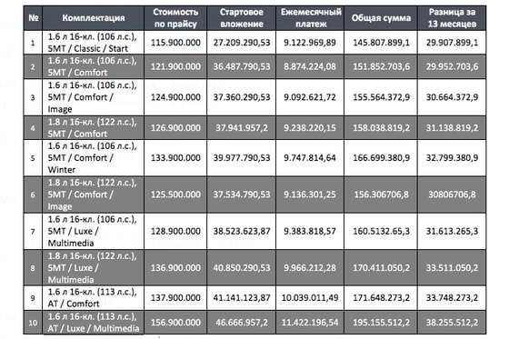 Таблица расчетов моделей LADA Vesta седан в лизинг с предоплатой 20% - на 13 месяцев