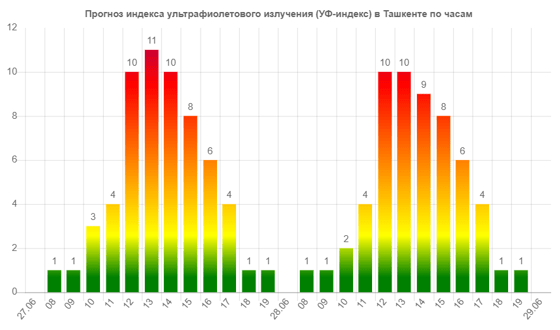Начиная с 12:00 столица Узбекистана окажется под влиянием 10-балльного УФ-излучения. К 13:00 показатель повысится до экстремальных 11 баллов.