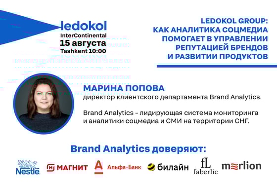 В рамках мероприятия с презентациями также выступят специалисты агентства и приглашенные эксперты. Руководитель Ledokol Analytics Шахзод Мухтаров выступит с докладом на тему «Social Listening в Узбекистане сегодня». Он расскажет на примерах, как крупным брендам помогает реалтайм мониторинг инфополя в выстраивании эффективных коммуникаций с аудиторией и повышении лояльности клиентов.
