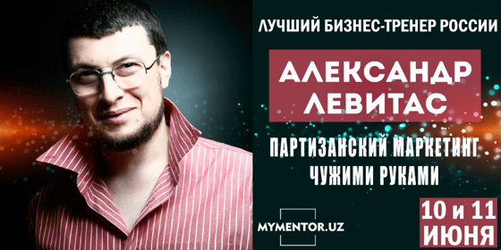 Лучший спикер и специалист №1 по партизанскому маркетингу, Александр Левитас, выступит в Ташкенте 10 и 11 июня в International Hotel Tashkent.