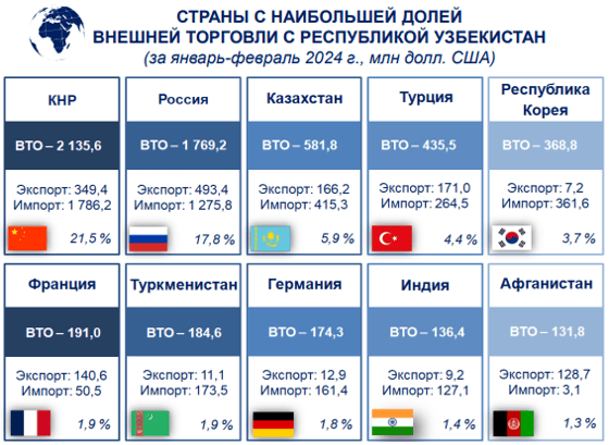 Стоит отметить, что в январе-феврале 2024 года внешнеторговый оборот Узбекистана составил $9,9 млрд.