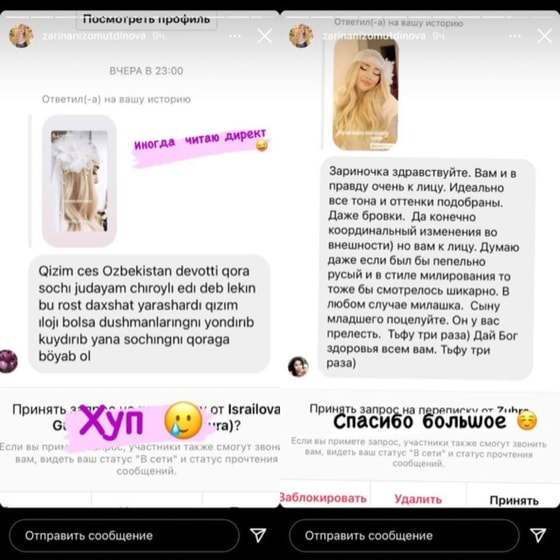 Как оказалось, несмотря на большую аудиторию, Низомуддинова иногда заглядывает в свой Direct и читает сообщения подписчиков.