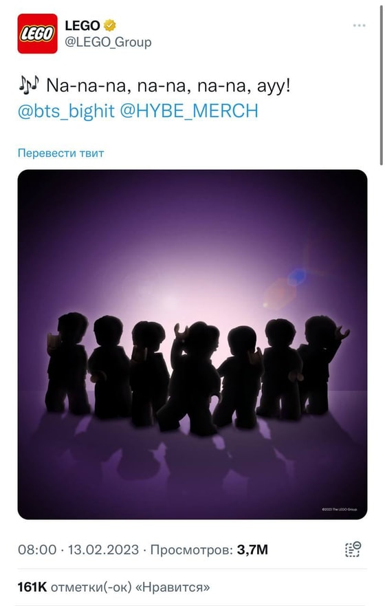 Официальный Twitter-аккаунт Lego анонсировал новый набор по южнокорейскому бой-бэнду BTS. Кажется, пользователи ждали этот коллаб, так как за 4 часа твит собрал уже 160 тысяч лайков.