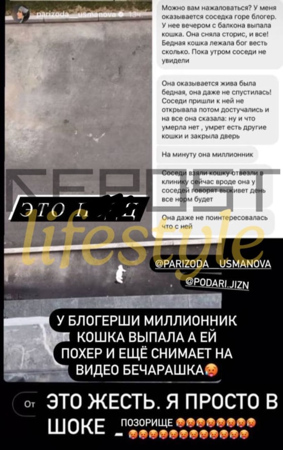 Накануне популярная блогерша Паризода Усманова опубликовала видео в Stories, рассказав, что с балкона упала ее кошка. Девушка сопроводила ролик плачущими эмодзи.
