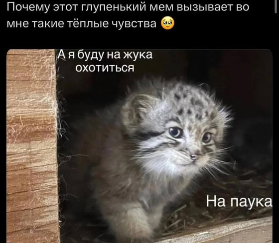 Интернет снова влюбился — на этот раз в манула. Новый мем с суровой, но очаровательной дикой кошкой стремительно разошелся по соцсетям. Его суть — в простой, но завораживающей фразе: «А я буду на жука охотиться. На паука».